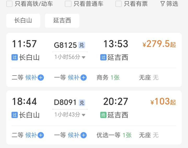 需要注意的是长白山——延吉一天只有2趟车,注意提前规划游玩安排。