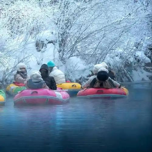 第八天雾凇漂流:清晨乘皮筏穿越雾凇长廊,推荐魔界或天池水漂流。